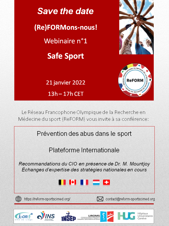 December 10, 2025ReFORM a organisé, le vendredi 21 janvier 2022 à un webinaire sur la thématique de la prévention des abus dans le sport (ou Safe Sport). Des intervenants de renom ont pu être invités, tels que le Dr Margo Mountjoy (McMaster University), Mme Fabienne Bourdais (Ministère Chargé des Sports France), Dr Sylvie Parent (Titulaire Chaire de Recherche Sécurité et Intégrité en Milieu sportif) et bien d’autres!
