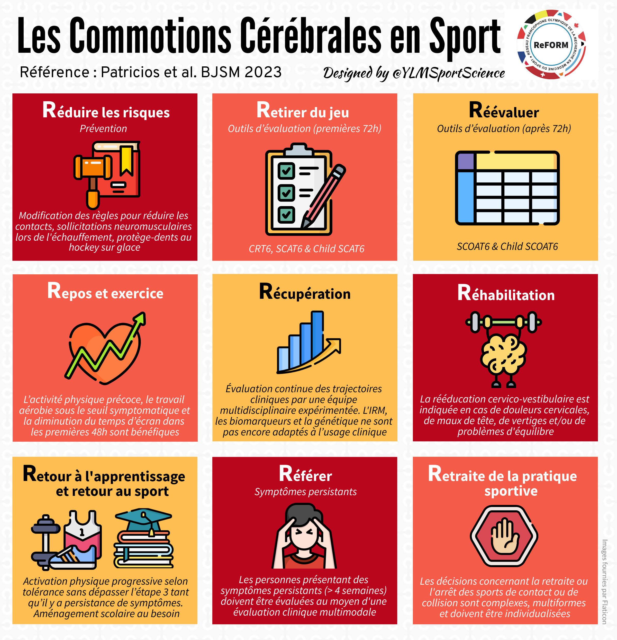 Elle met en avant une approche progressive et centrée sur l’athlète, allant de la réduction des risques et du retrait immédiat du jeu, à la réévaluation clinique, la récupération active, la réhabilitation ciblée et le retour progressif à l’apprentissage et au sport.
