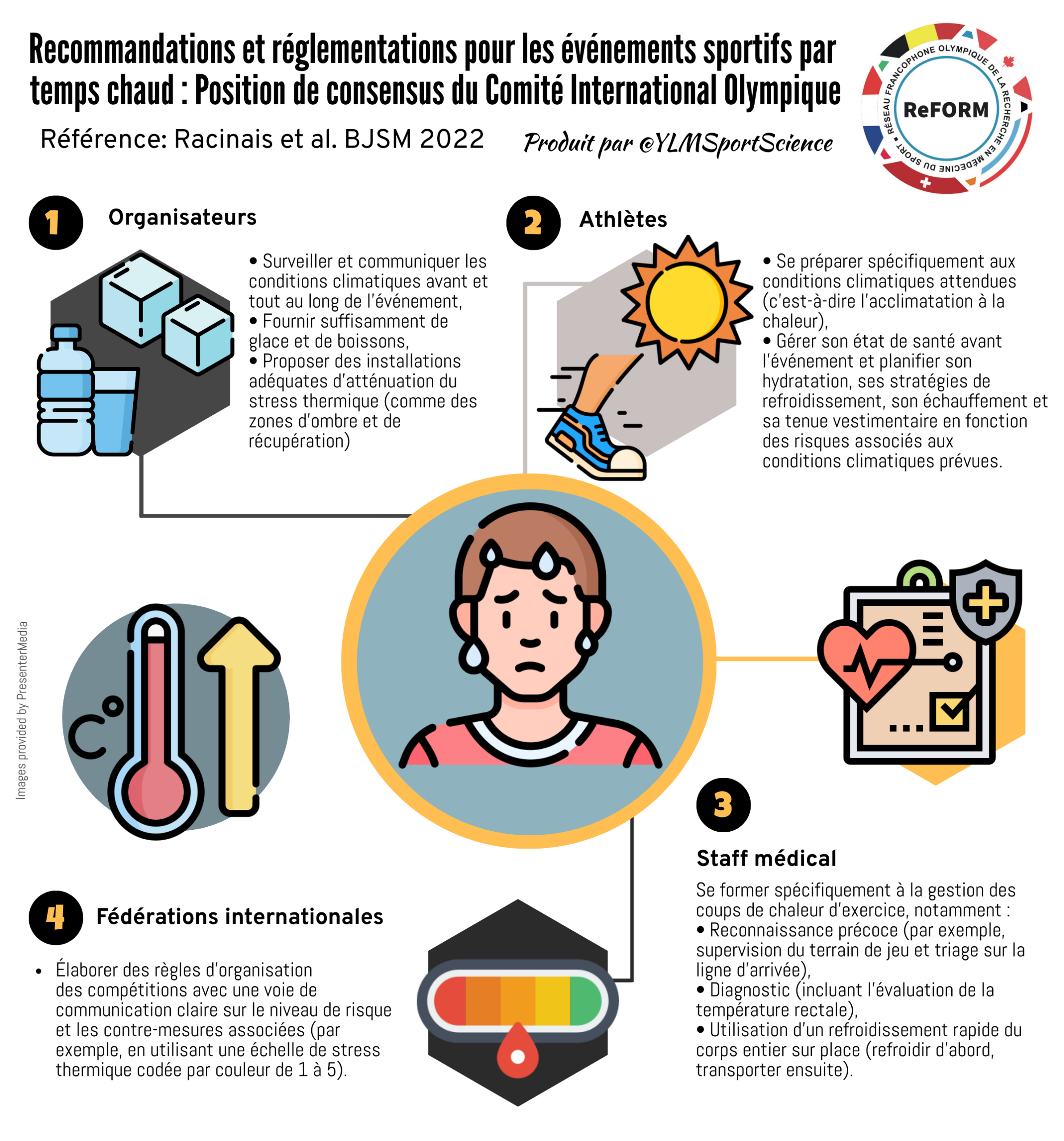 Cette infographie synthétise les recommandations du Comité International Olympique pour la prévention des risques liés à la chaleur lors des événements sportifs, chez les athlètes entraînés comme chez les pratiquants récréatifs.