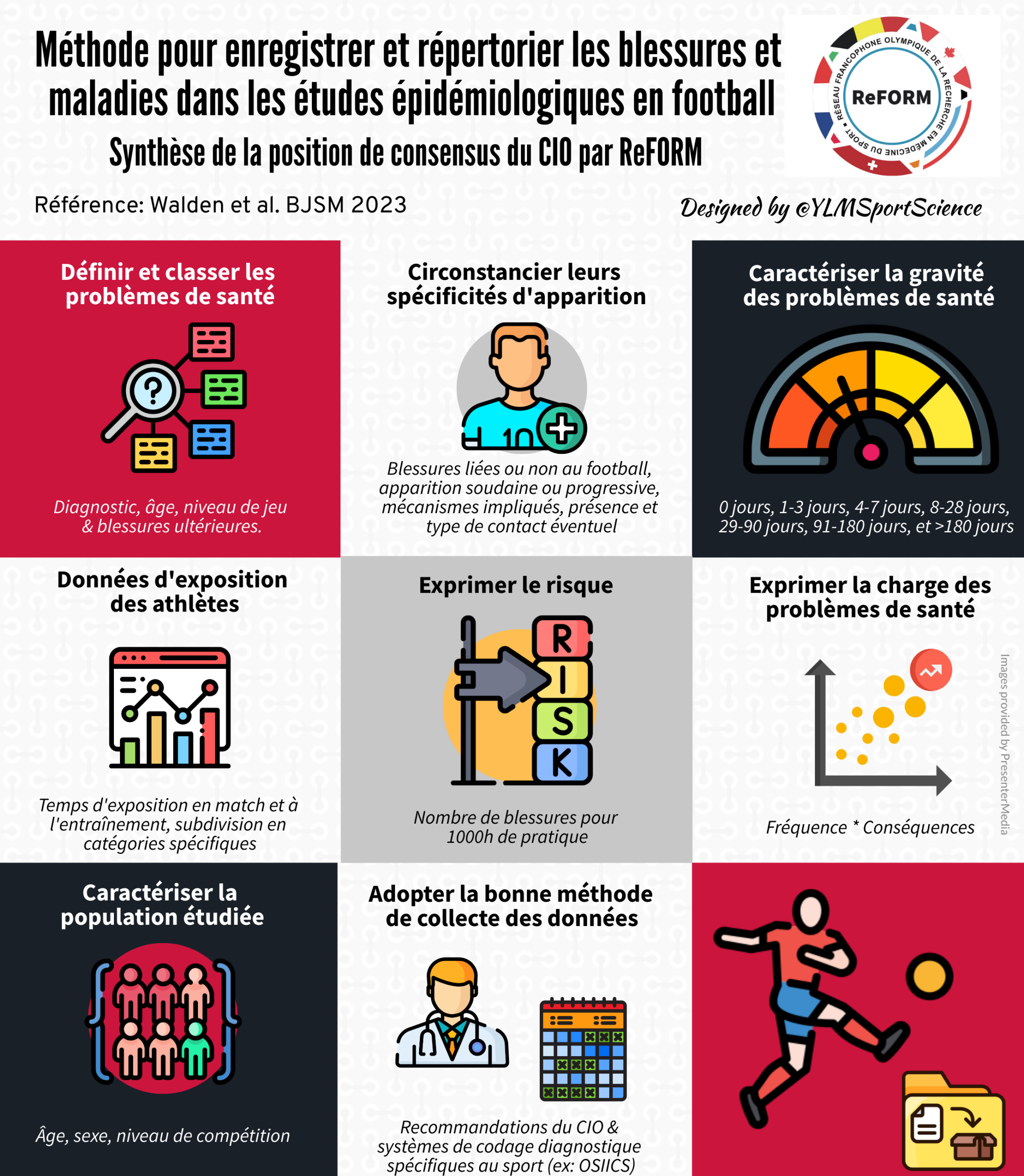 Cette infographie présente les recommandations méthodologiques du Comité International Olympique pour enregistrer, classifier et analyser les blessures et maladies dans les études épidémiologiques en football.